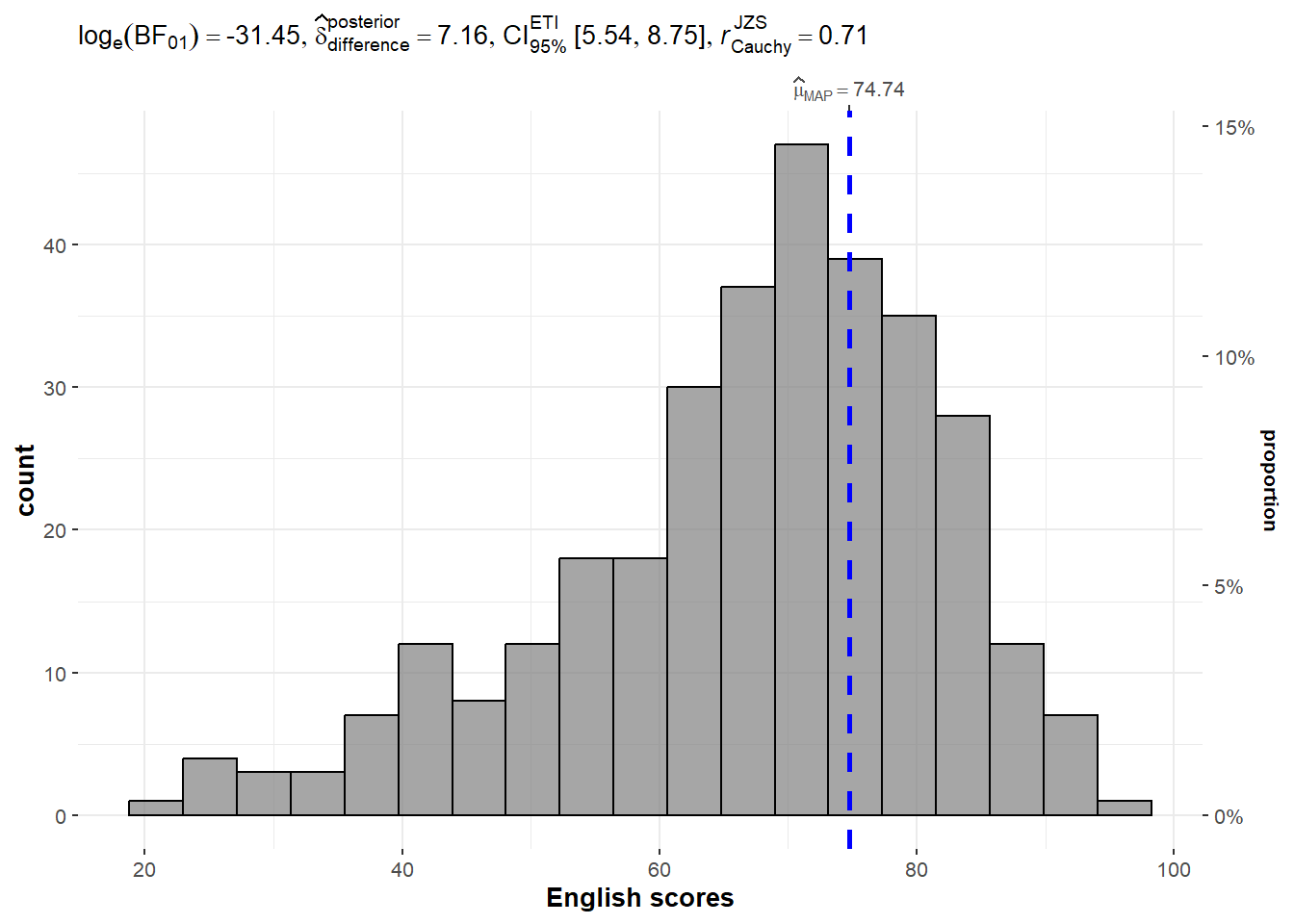 gghistostats() produces a histogram with statistical details from a one-sample test included in the plot as a subtitle.