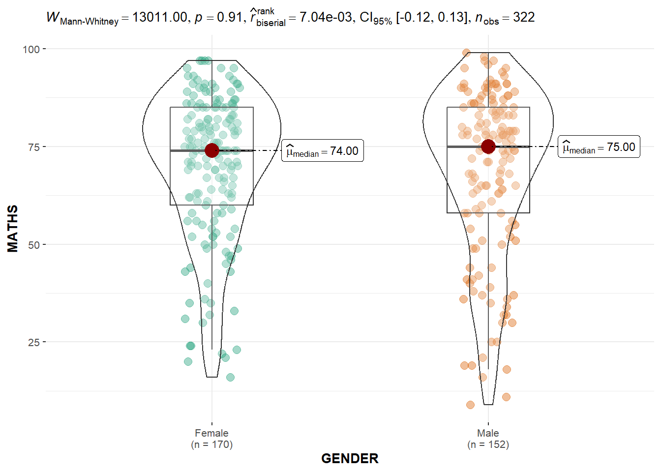 ggbetweenstats() is used to build a visual for a two-sample mean test of Maths scores by gender as shown below.