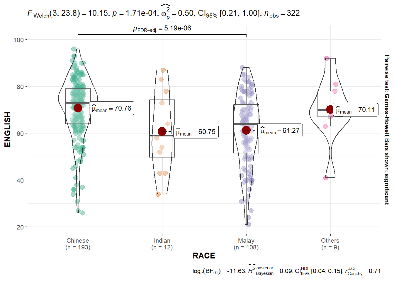 ggbetweenstats() is used to build a visual for a one-way ANOVA test on English scores by race as shown below.