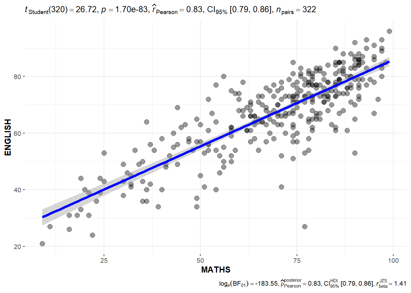 ggscatterstats() is used to build a visual for a significant Test of Correlation between Maths scores and English scores as shown below.