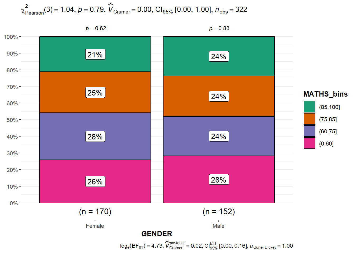 The Maths scores are binned into a 4-class variable by using cut() and then ggbarstats() is used to build a visual for the significant Test of Association.