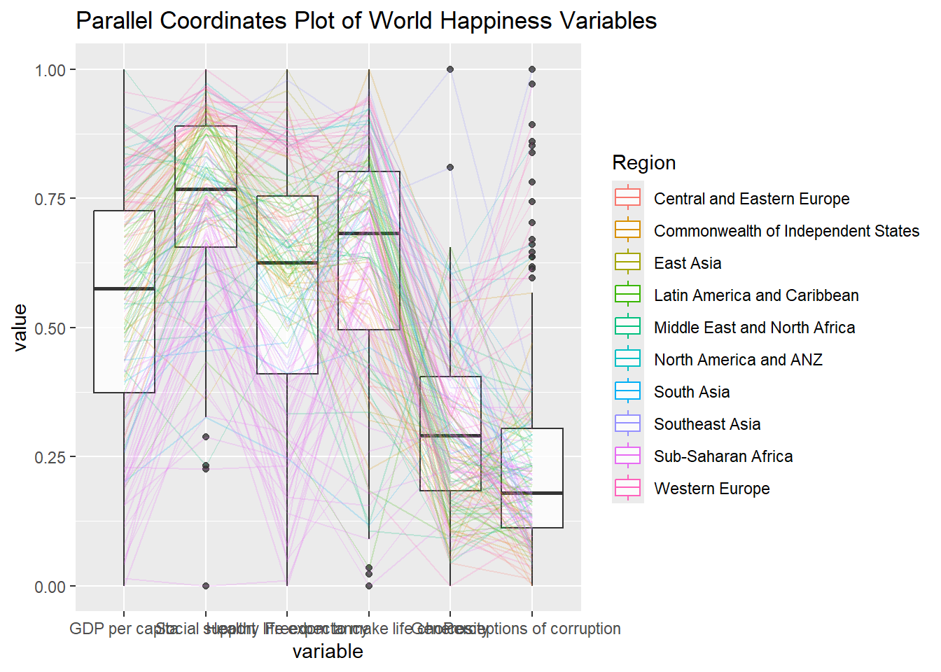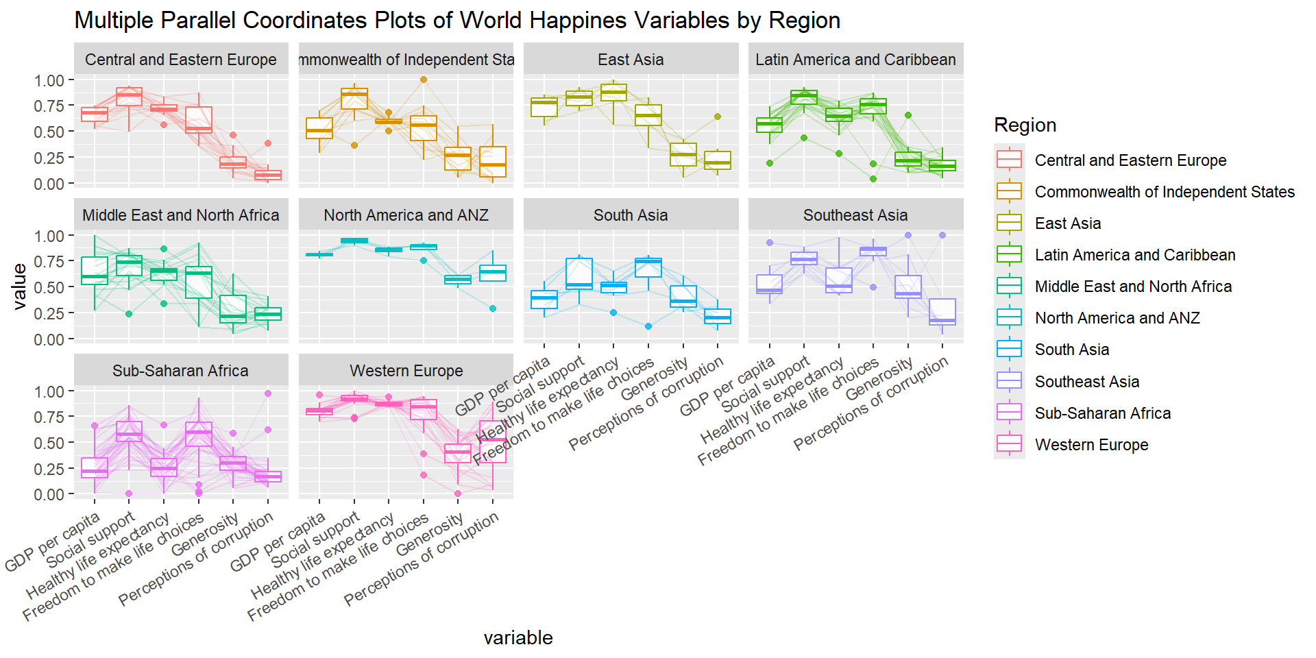 title = "Multiple Parallel Coordinates Plots of World Happines Variables by Region") +