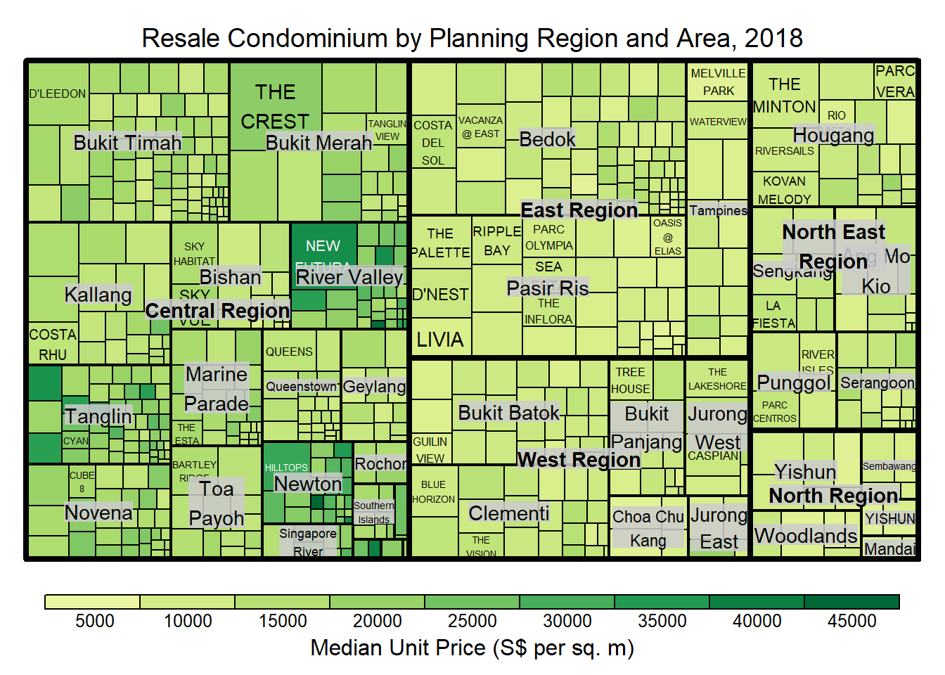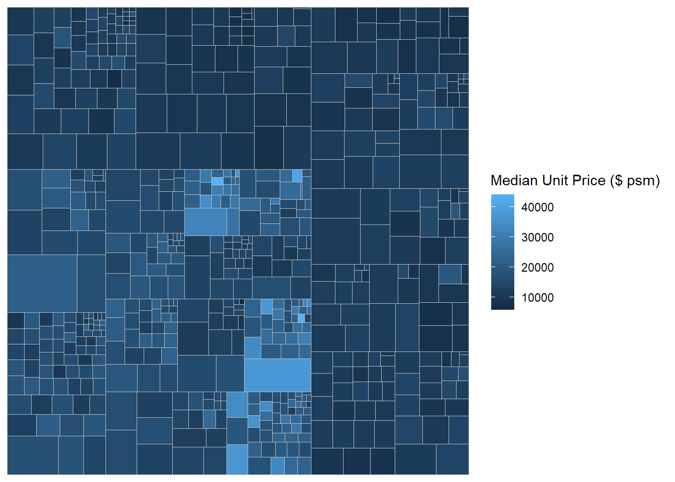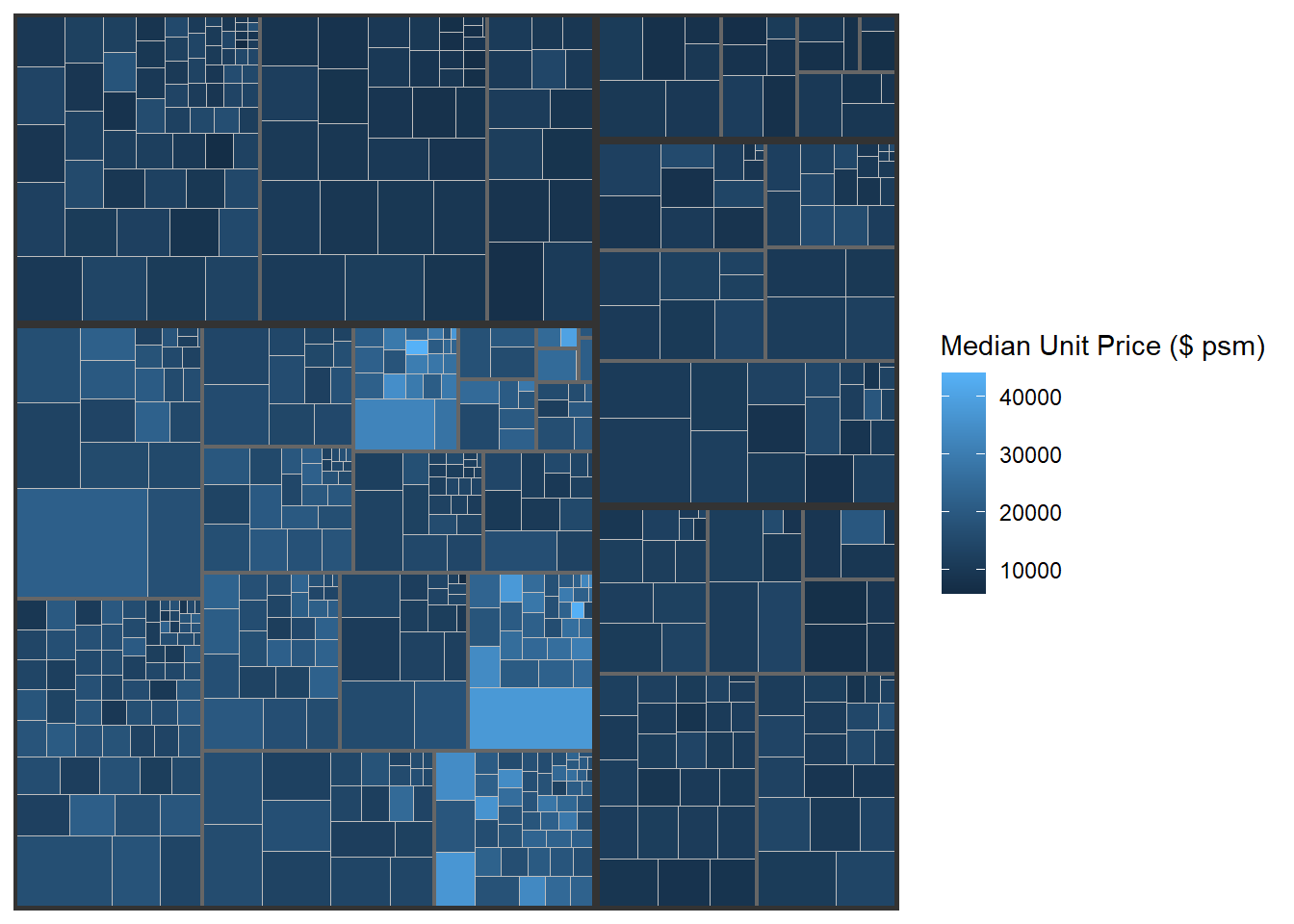 Although the colour palette used is ‘RdYlBu’ but there are no red rectangles in the treemap above. This is because all the median unit prices are positive. The reason why we see only 5000 to 45000 in the legend is because the range argument is by default c(min(values, max(values)) with some pretty rounding.