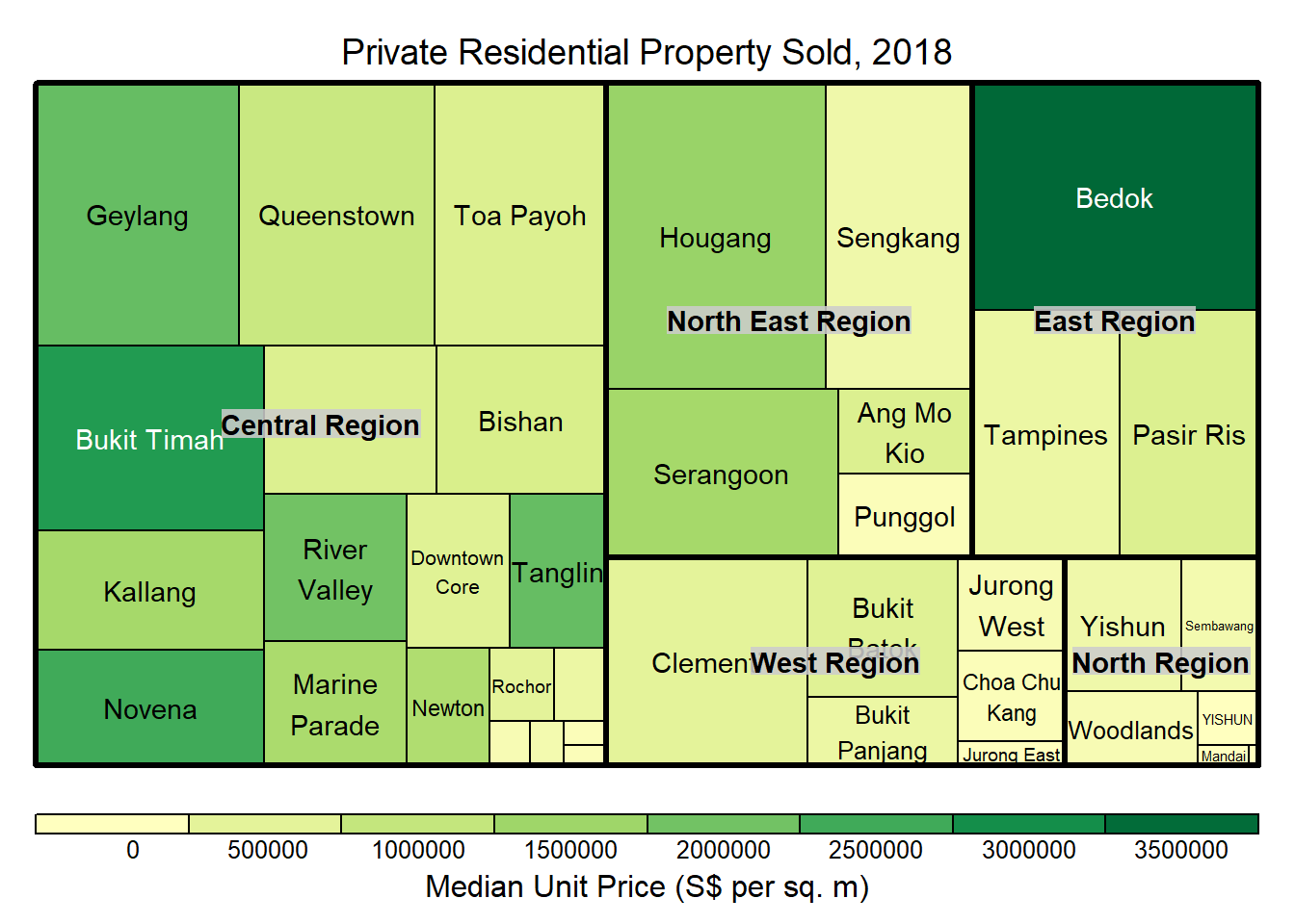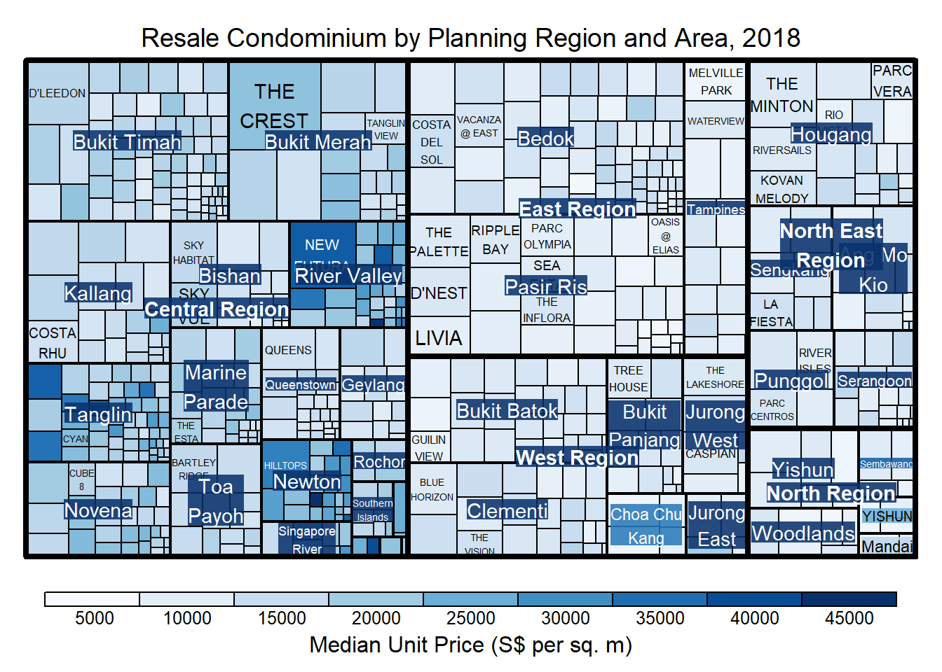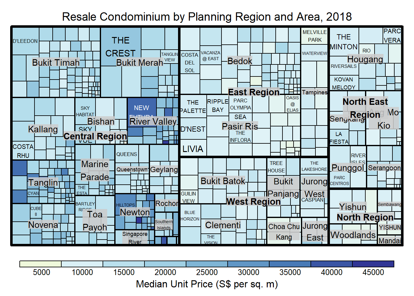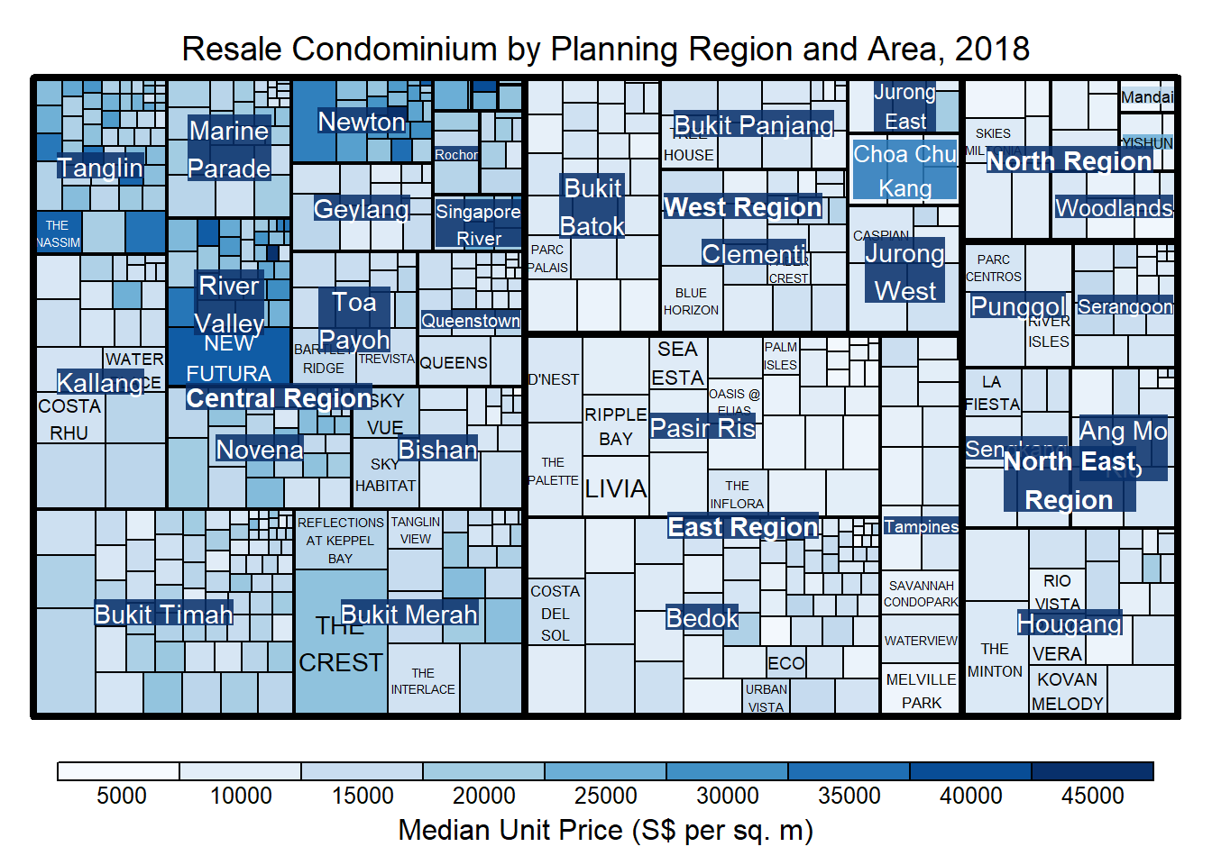 Although the colour palette used is ‘RdYlBu’ but there are no red rectangles in the treemap above. This is because all the median unit prices are positive. The reason why we see only 5000 to 45000 in the legend is because the range argument is by default c(min(values, max(values)) with some pretty rounding.