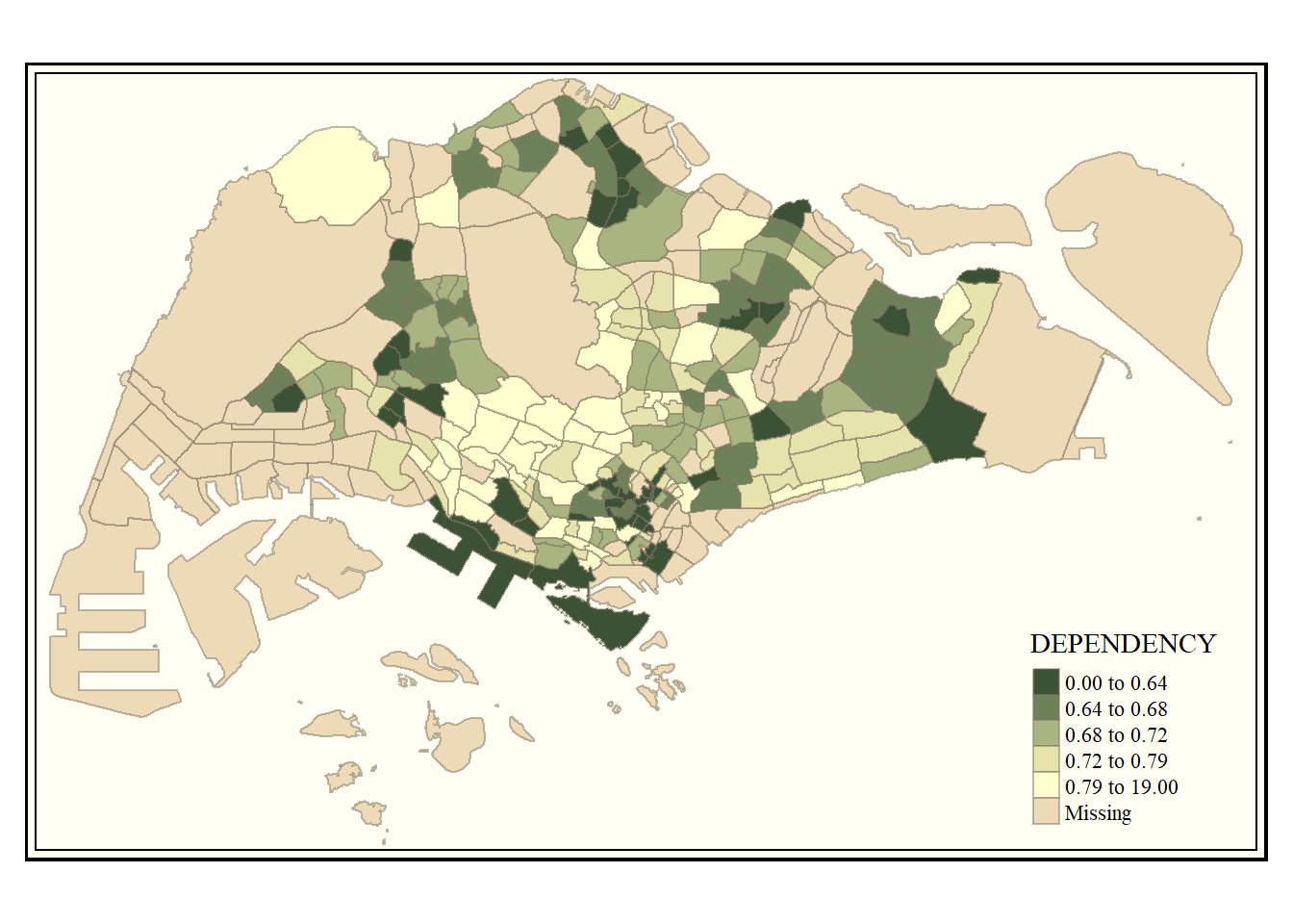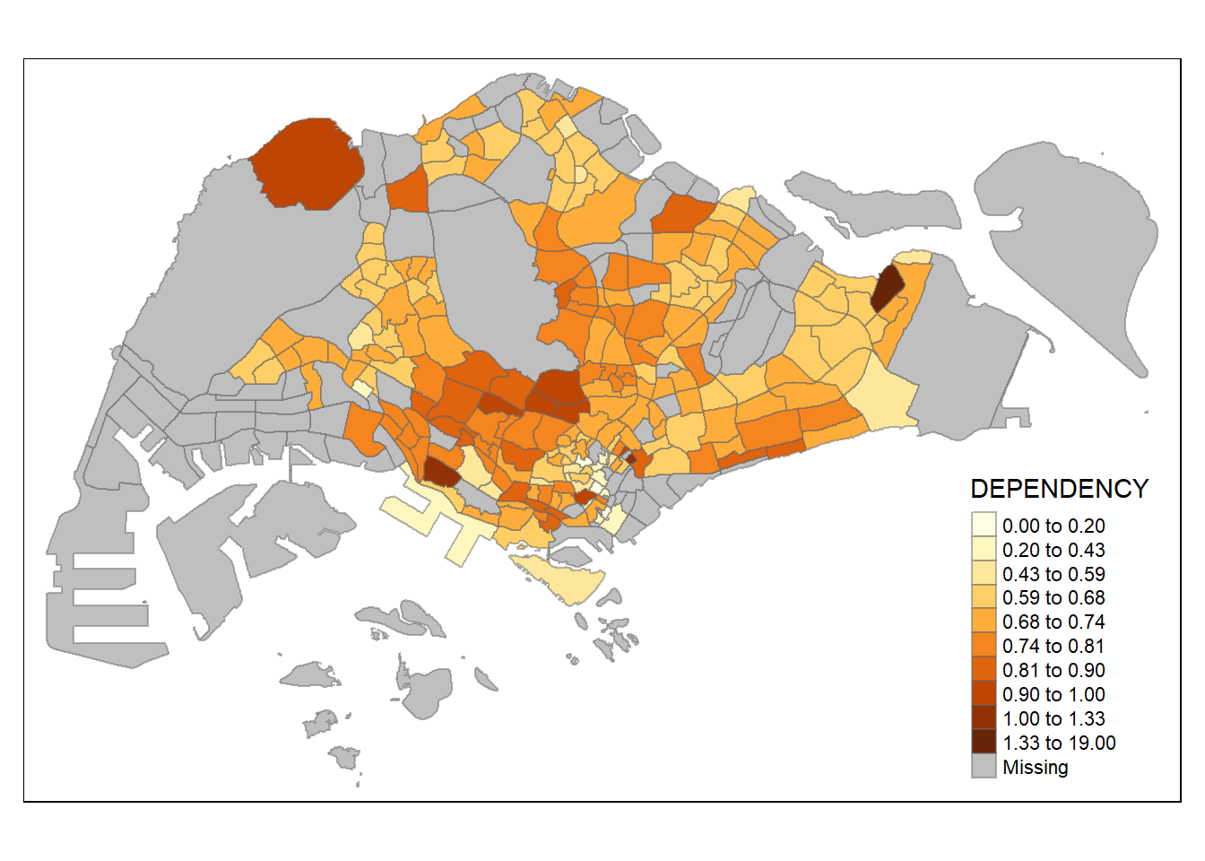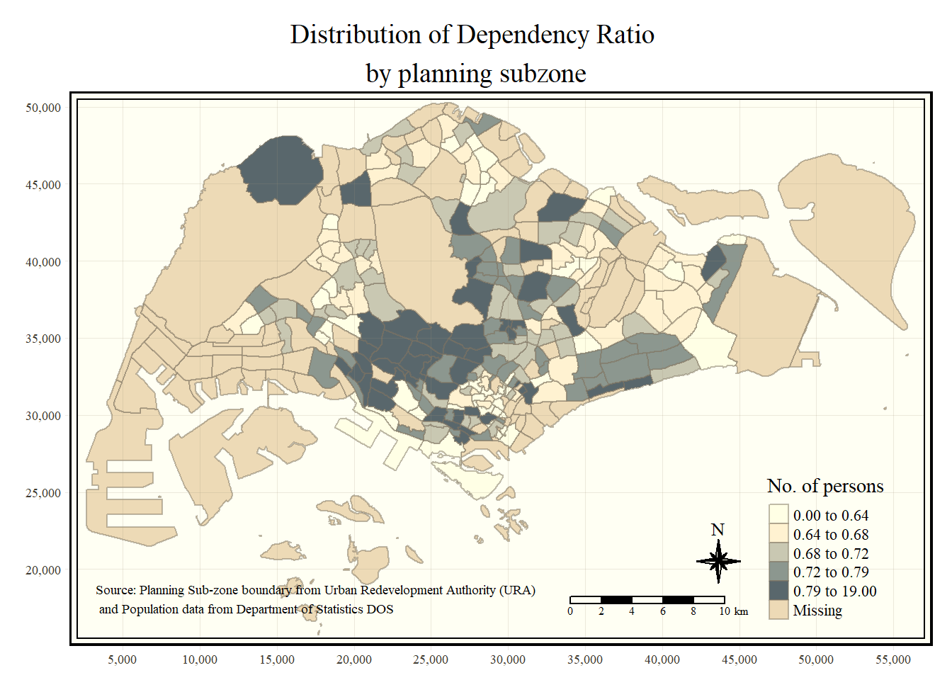 tm_layout(main.title = "Distribution of Dependency Ratio by planning subzone \n(Jenks classification)",