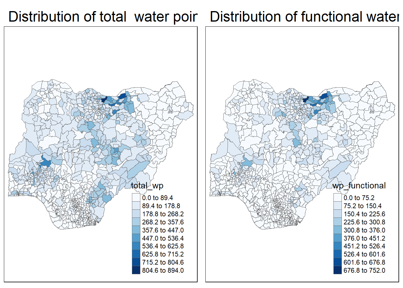 The following code chunk is to plot choropleth maps showing the distribution of functional and total water point by LGA and arrange them side by side.