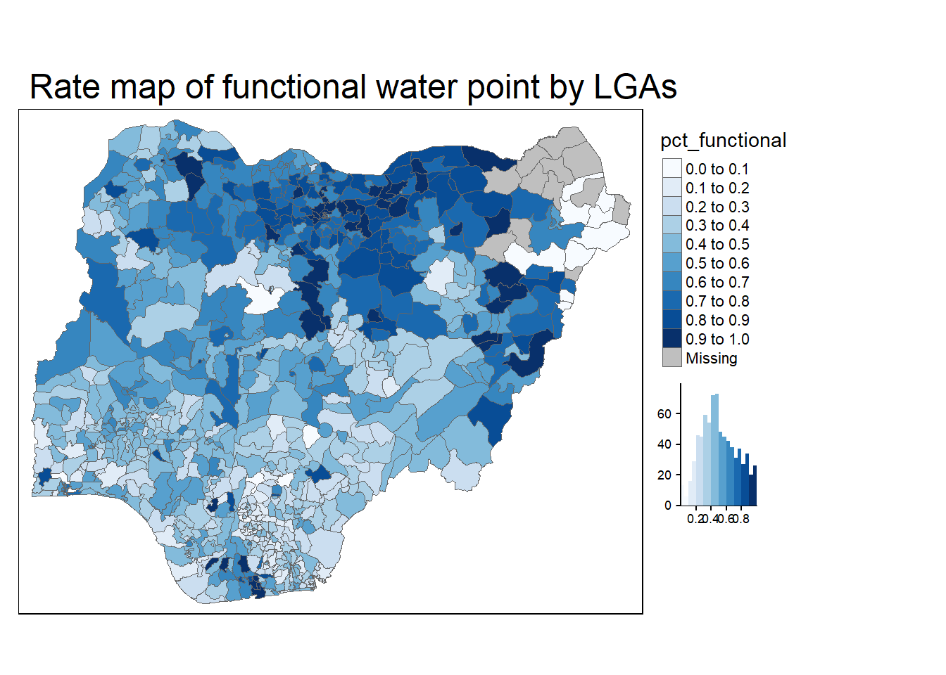 tm_layout(main.title = "Rate map of functional water point by LGAs",